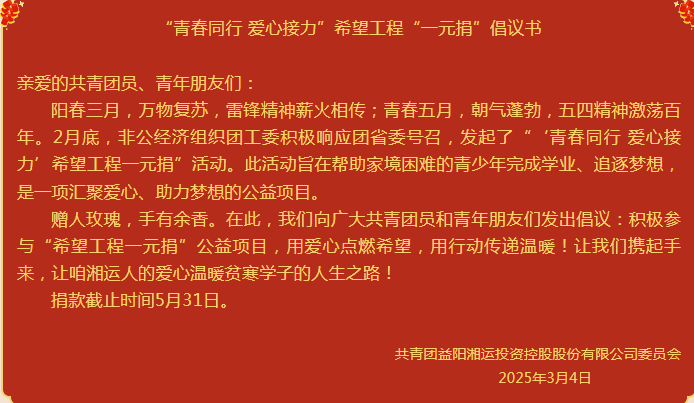 3月4日,公司團(tuán)委積極響應(yīng)非公經(jīng)濟(jì)組織團(tuán)工委的號(hào)召,發(fā)出了“一元捐”倡議書。“‘青春同行 愛心接力’希望工程一元捐”活動(dòng)由團(tuán)省委發(fā)起,旨在幫助家境困難的青少年完成學(xué)業(yè)、追逐夢(mèng)想,是一項(xiàng)匯聚愛心、助力夢(mèng)想的公益項(xiàng)目。